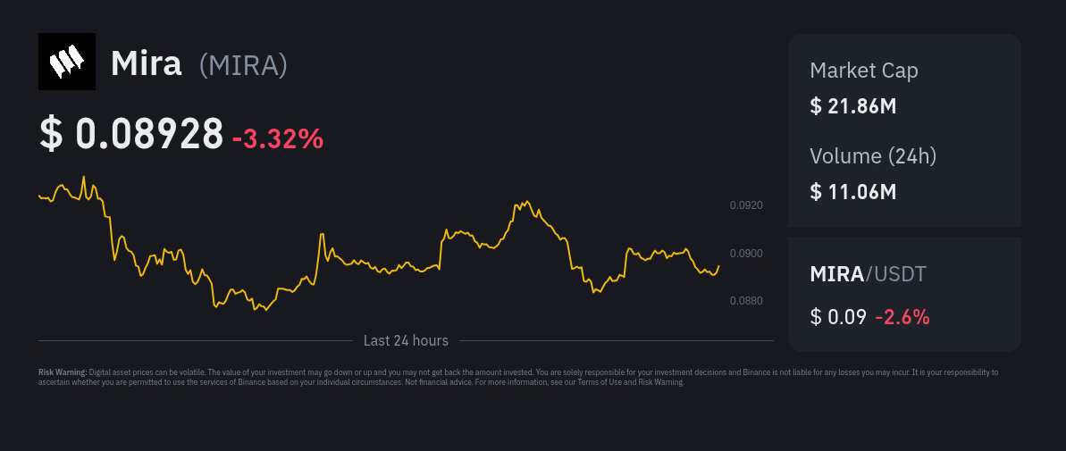 Speaking of price, here’s the latest $MIRA chart from Binance it’s dipped a bit in the last 24 hours, but the volume is strong at over $11M, hinting at growing interest: