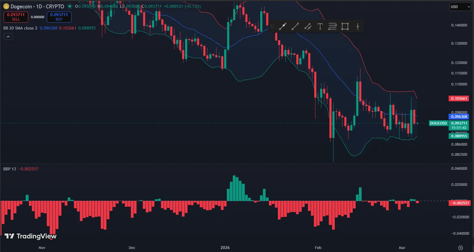 Se Dogecoin riesce a riprendere la banda centrale di Bollinger intorno a $0,096, il prezzo potrebbe tentare un movimento verso la zona di resistenza di $0,103, dove attualmente si allinea la banda superiore.