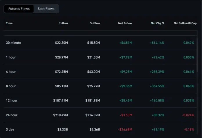 I recenti dati sul flusso dei futures mostrano movimenti di capitale misti ma attivi nel mercato dei derivati di Dogecoin. Negli ultimi 30 minuti, i flussi in entrata si attestano a circa $22,30 milioni, mentre i flussi in uscita si avvicinano a $15,50 milioni, lasciando un afflusso netto di circa $6,81 milioni.