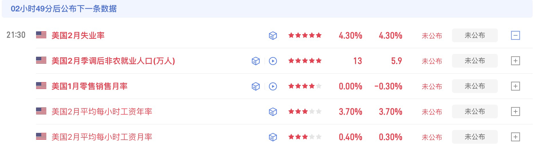 今晚21:30公布美国2月份就业数据,失业率与2月非农就业数据,目前市场预期失业率不变,2月非农数据走弱。