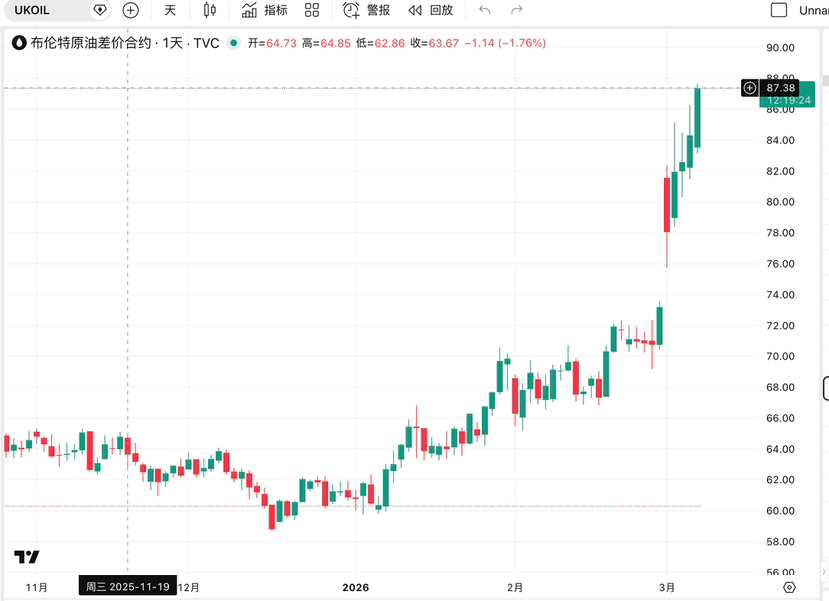 截至目前为止,在中东地缘风险未见缓和的阶段下,各方对霍尔木兹海峡通航表示担忧,虽然伊朗并不承认封锁海峡,但是实际上已经形成封锁的事实,当前原油价格飙升至87.1美元。