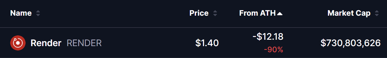 $RENDER il token esemplifica il dolore del settore. Il token ha raggiunto un massimo storico di $12.18 a metà del 2024. Oggi scambia a $1.40—una devastante riduzione del -90% dal picco.
