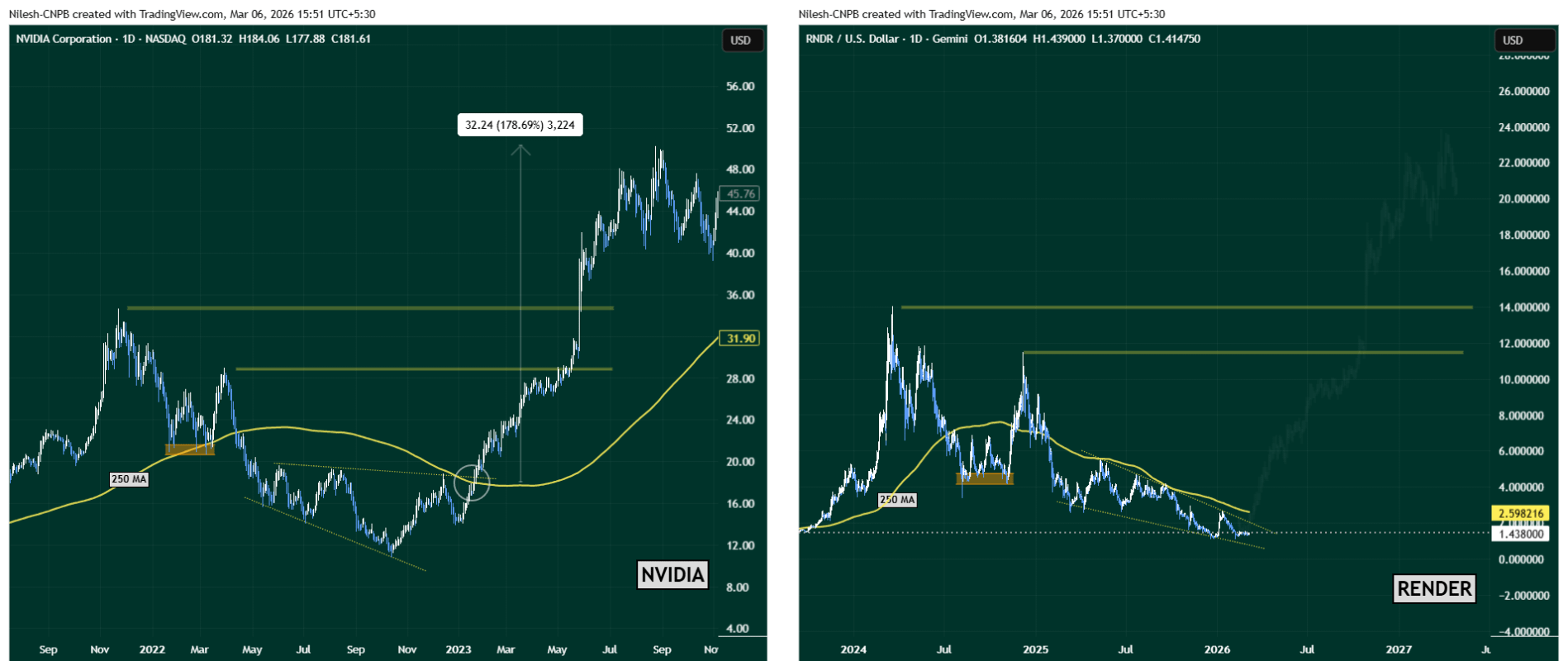 Gli analisti di mercato stanno ora confrontando la struttura dei prezzi di RENDER con un modello storico visto nelle azioni di NVIDIA tra la fine del 2021 e l'inizio del 2023.