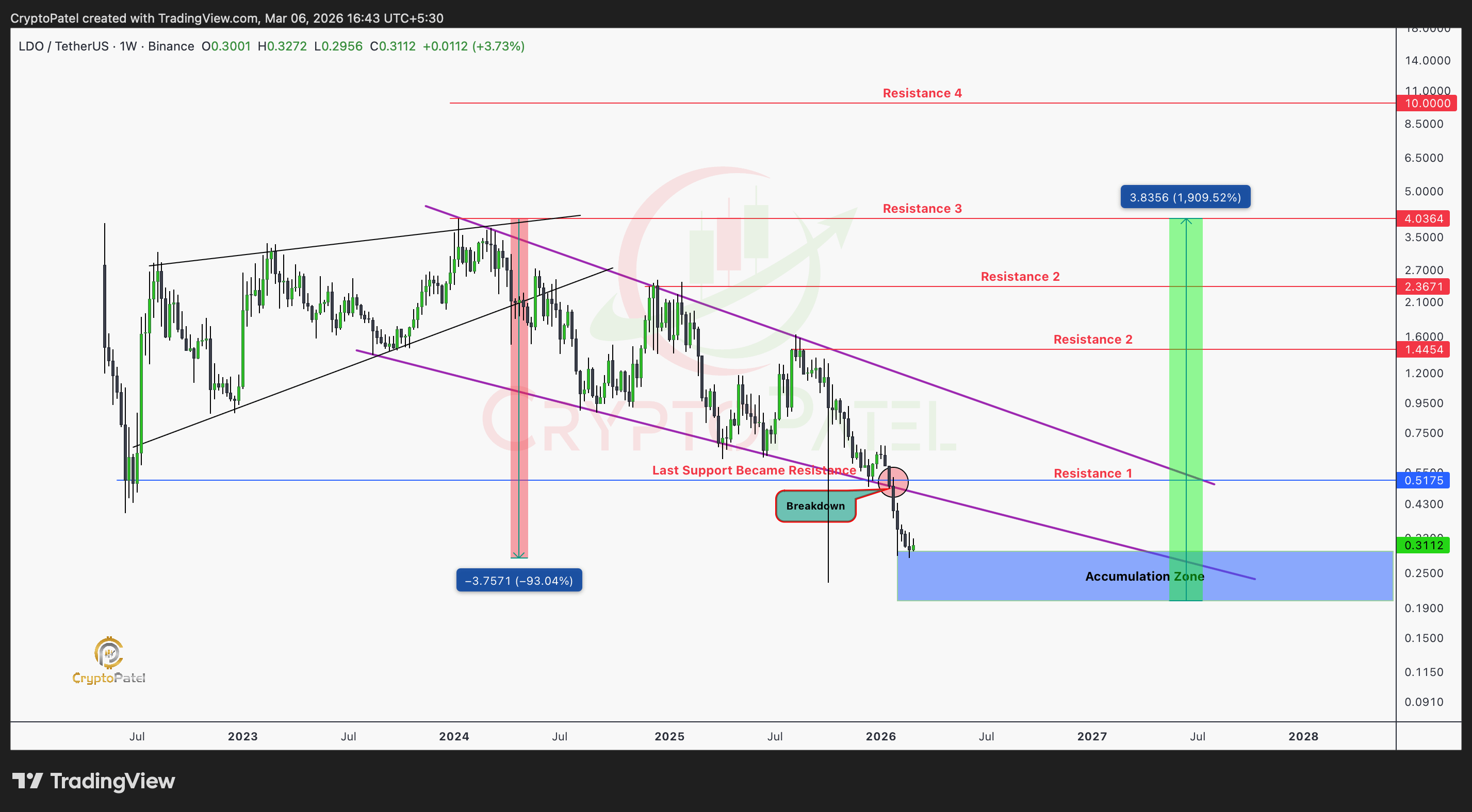#LDO stava negoziando all'interno di un canale discendente di più mesi sul grafico settimanale prima che l'ultimo supporto $0.517 fosse rotto a gennaio 2026 & 93%+ correzione in soli 14 mesi. Il prezzo è entrato in una zona di accumulo definita da sé tra $0.30-$0.20.