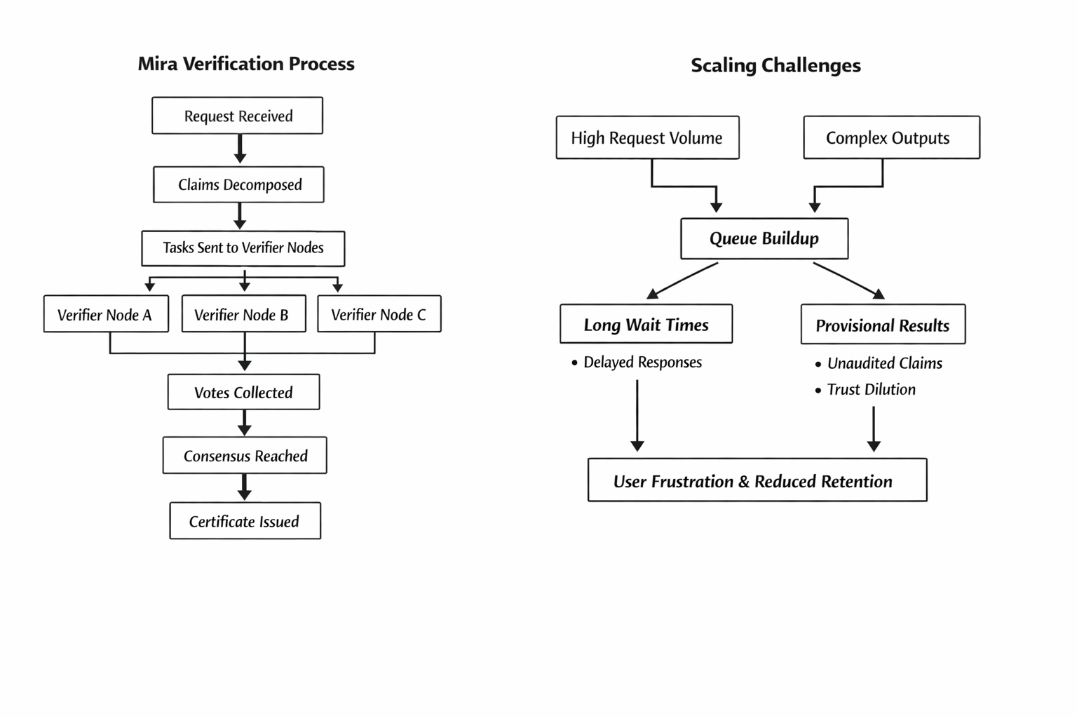 I stopped treating Mira like a clean “AI verification” story the first time I thought through what actually happens under load. Not in the whitepaper abstract way. In the ugly workflow way. A request comes in, the output gets broken into claims, those claims get fanned out to verifier nodes, votes come back, consensus gets tallied, and only then do you get the certificate that makes the word verified mean anything. That’s the moment the trade looked different to me. The problem isn’t whether Mira can verify. On paper, it can. The real question is what happens when too many people want that proof at once.