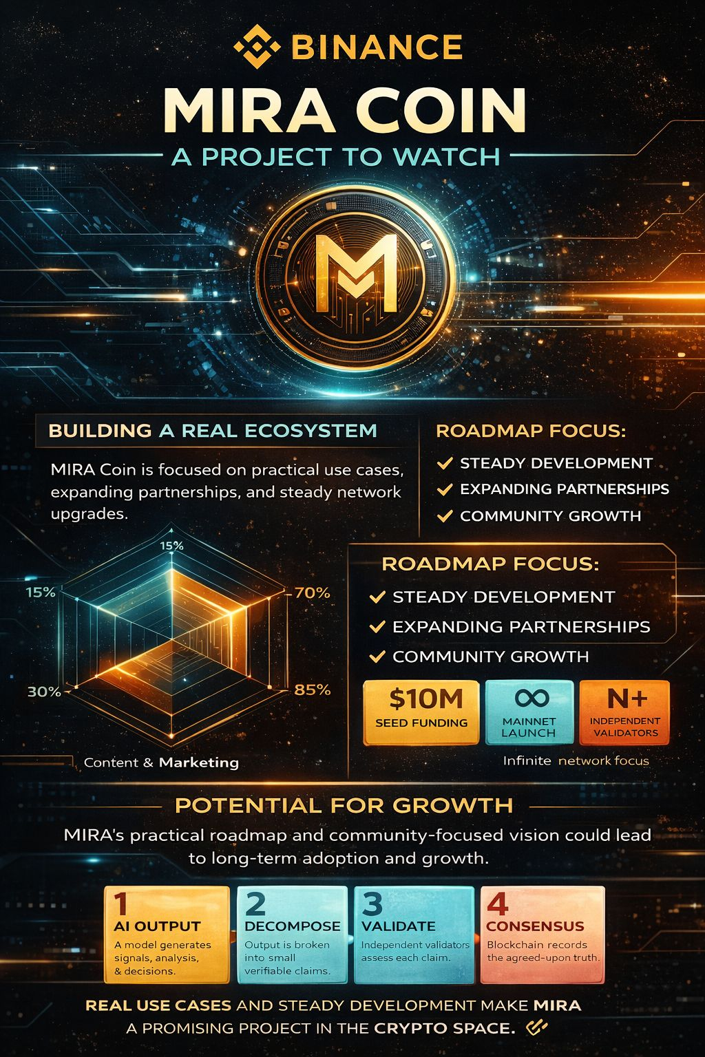 $MIRA Coin is slowly gaining attention in the crypto space as more people start noticing its development and future plans. The team behind @Mira - Trust Layer of AI is working on building a useful ecosystem where the coin can be used in real applications instead of just trading. Their roadmap shows clear steps for improving the network, expanding partnerships, and growing the community. What makes MIRA interesting is the focus on steady progress rather than quick hype. Many early supporters believe that if the team continues delivering updates and new features, the project could gain stronger adoption over time. Like any crypto project, it still carries risk, but its vision of creating a practical and community-driven platform is what keeps investors and followers interested. As the roadmap moves forward, the growth of the #Mira community and its real-world use cases will likely play an important role in shaping the future of this coin.