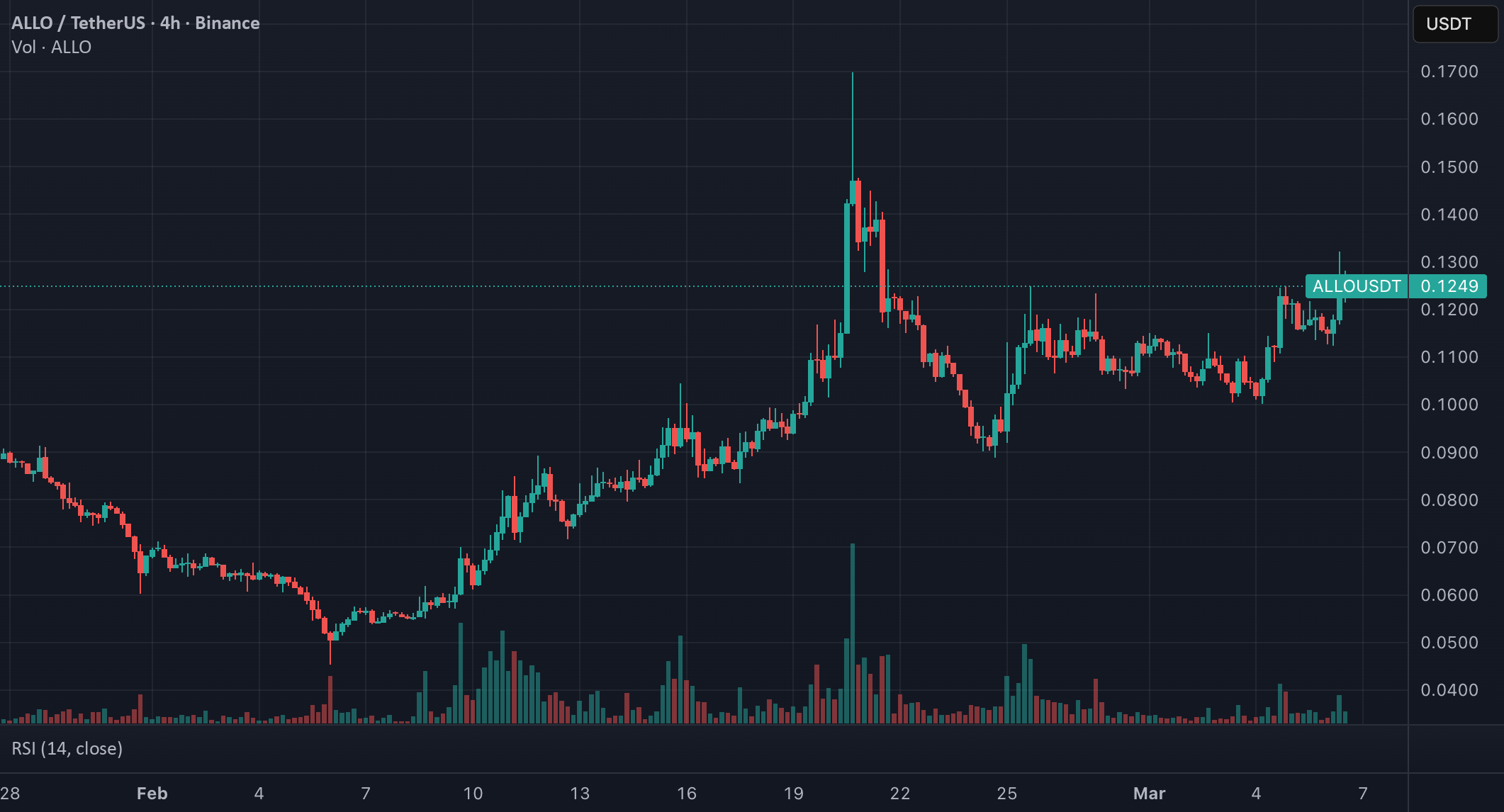 In questo momento ALLO sta scambiando vicino a 0.1235 in un regime misto.