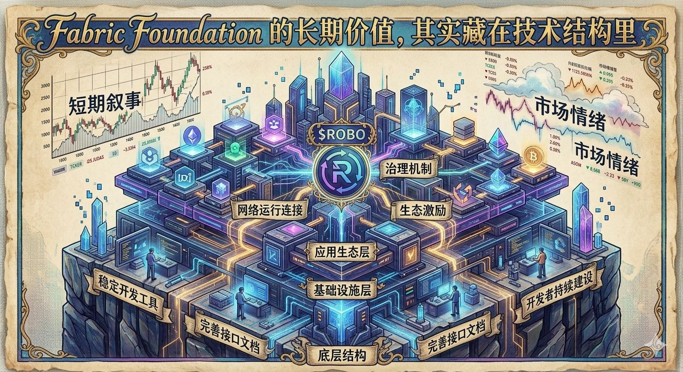 从这个角度再看 $ROBO ,短期行情其实并不是最关键的变量。更值得关注的是 @Fabric Foundation 的技术结构是否能够持续支持生态扩展。如果开发环境保持稳定,应用层逐渐丰富,治理机制也能随着规模扩大而不断完善,那么生态增长就不只是一次市场周期里的故事,而更像是一项需要时间完成的工程。