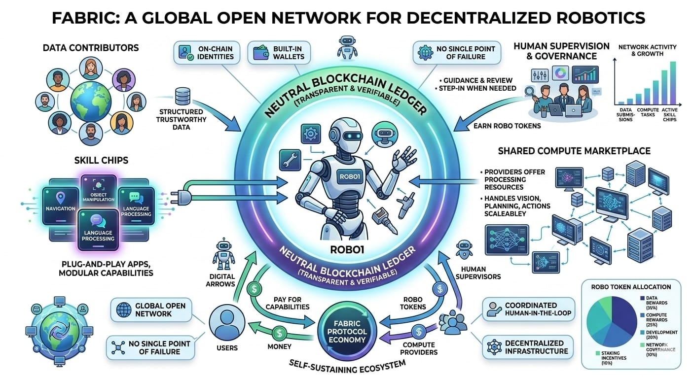 Per la robotica stessa, il sistema utilizza identità on-chain, portafogli integrati e regole economiche in modo che i robot agiscano come agenti indipendenti. Le persone aiutano fornendo dati, controllando il lavoro o intervenendo per supervisionare quando necessario e guadagnano token ROBO per i loro sforzi. Allo stesso tempo, chiunque voglia utilizzare le capacità dei robot paga per questo, il che mantiene l'intero ciclo in corso e in crescita da solo.