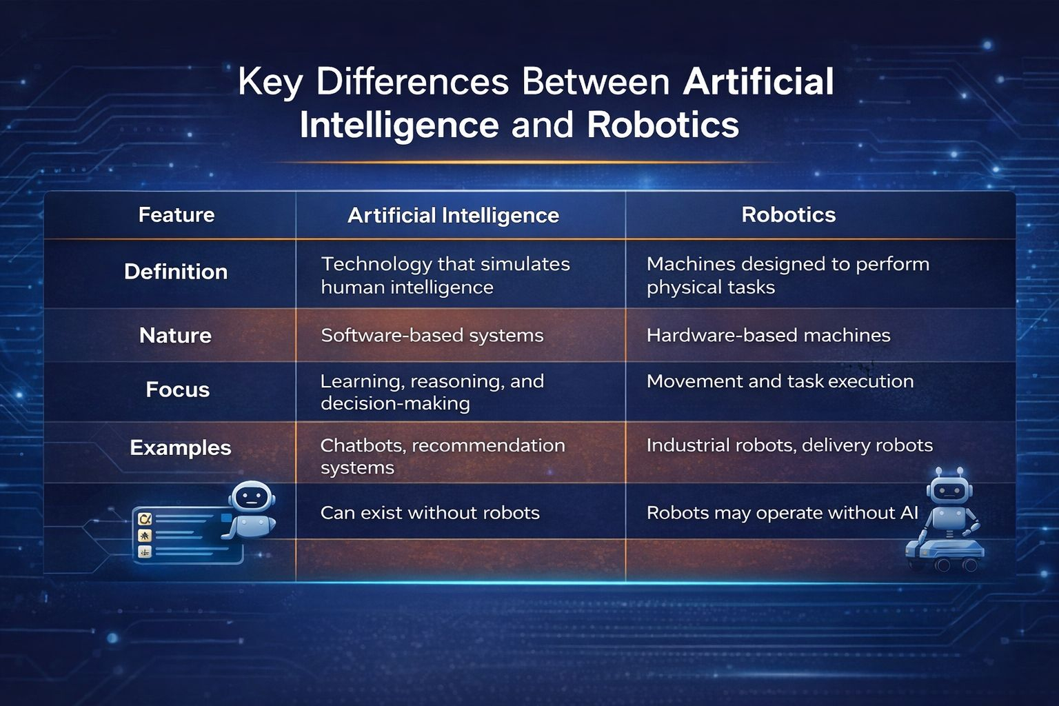Artificial Intelligence and Robotics are closely connected but fundamentally different technologies. AI focuses on developing intelligent systems that can think, learn, and make decisions, while Robotics focuses on building machines capable of performing physical tasks.