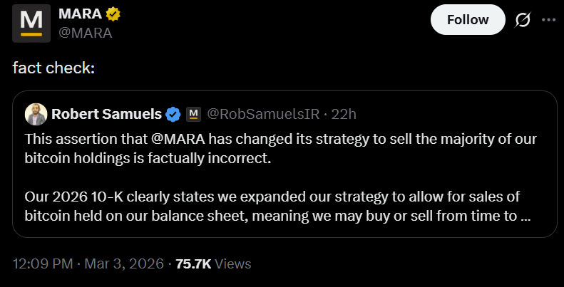 MARA chiarisce la strategia del tesoro Bitcoin dopo le preoccupazioni per le vendite