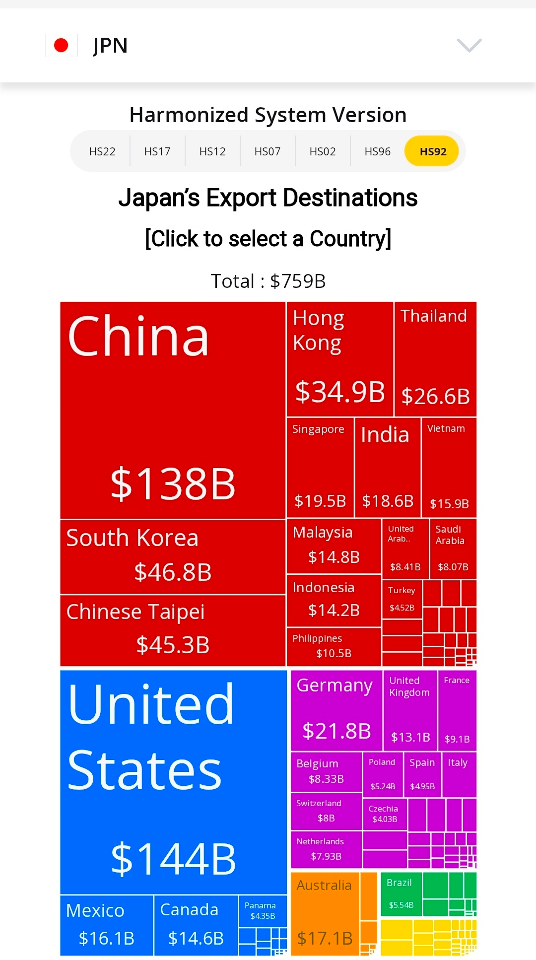 Japan’s global exports show a strong trade network worth $759B. The 🇺🇸 United States is the biggest buyer, importing about $144B of Japanese goods, slightly ahead of 🇨🇳 China at $138B. These two giants dominate Japan’s export market.