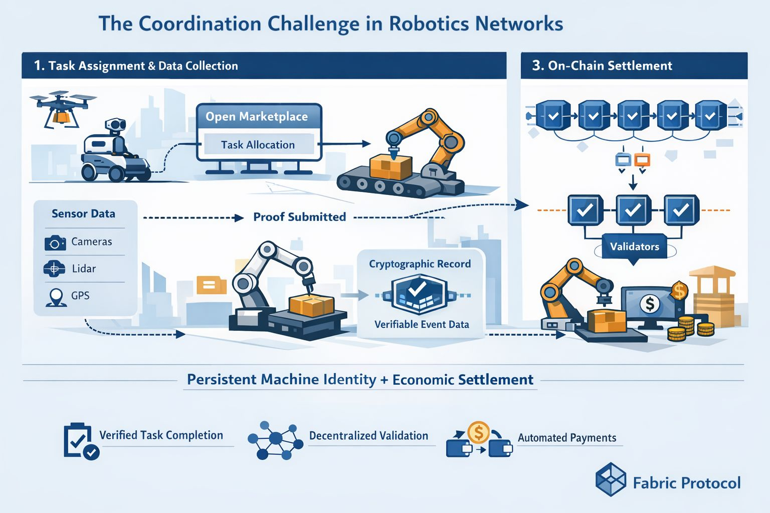 In theory, this could allow robots owned by different entities to interact economically while relying on a neutral coordination layer.