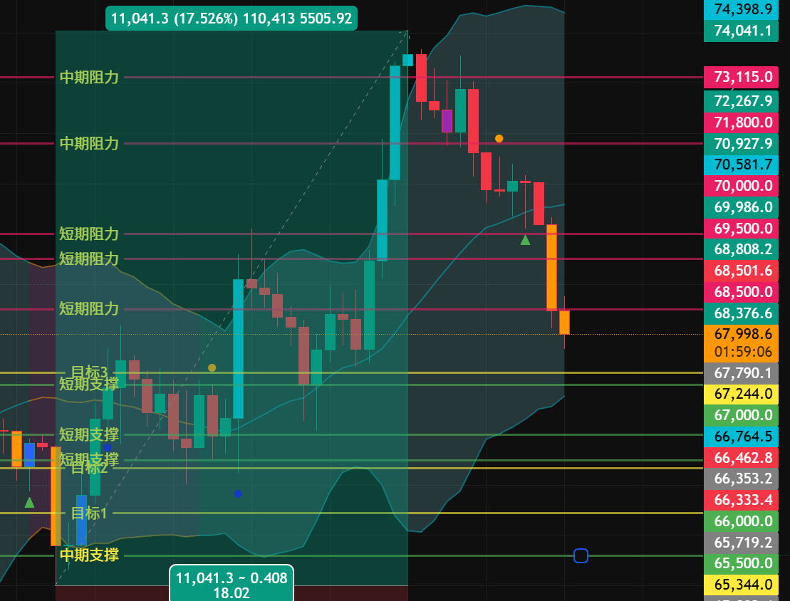 67.000: Supporto immediato. Questo è il punto di pausa a breve termine della grande caduta di 5000 punti, nonché la zona cuscinetto psicologica prima del livello intero. Se c'è un rimbalzo dopo un eccesso di ribasso, di solito inizia da qui.