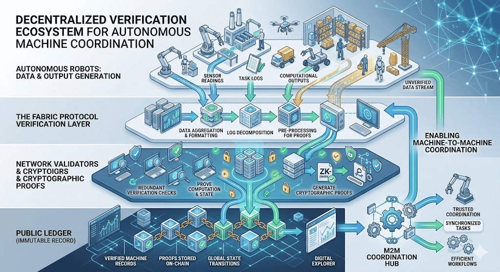 Fabric suggests and I increasingly agree that the future of robotics may rely less on creating smarter machines and more on developing systems that enable those machines to trust one another.Create a layered ecosystem diagram showing autonomous robots generating data and computational outputs that flow into the Fabric Protocol verification layer. Network validators confirm these outputs through cryptographic proofs before storing them on a public ledger, illustrating how decentralized verification enables machine-to-machine coordination.