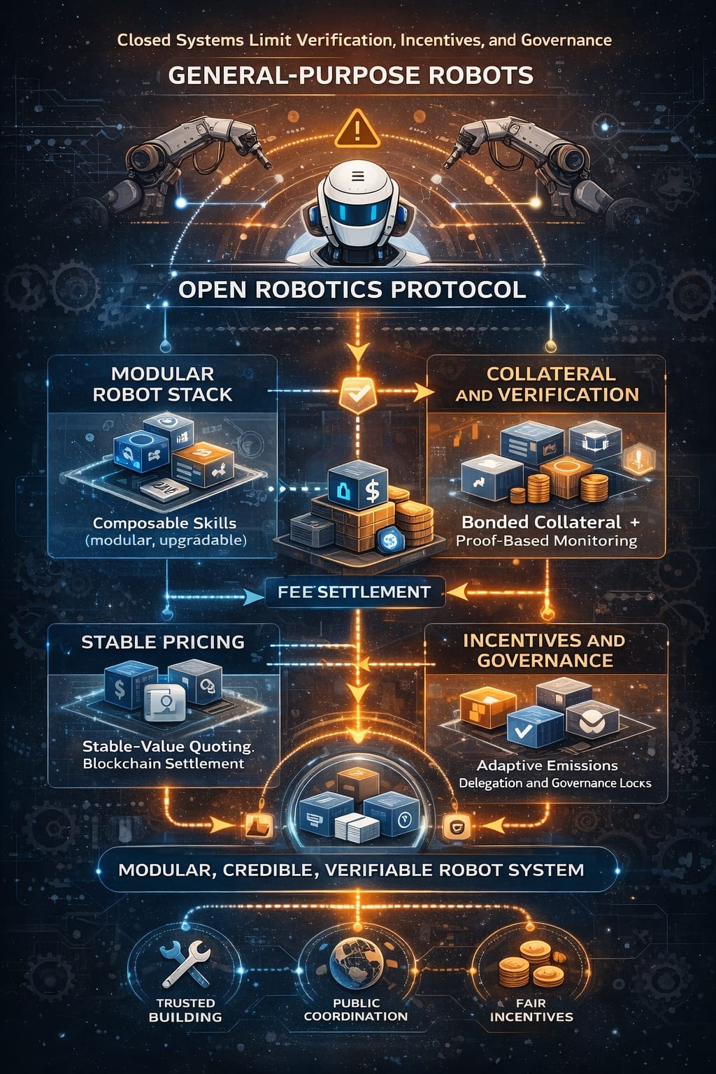 That distinction matters because general-purpose robots do not fail only when intelligence is weak. They also fail when the surrounding system is incomplete. A machine that is expected to operate across changing tasks and environments needs more than perception, planning, and control. It needs identity, task assignment, payment logic, quality tracking, upgrade pathways, accountability rules, and a credible way to measure whether participants are behaving honestly. In closed architectures, those pieces usually sit inside one company or one vertically managed platform. That can speed up iteration in the early stage, but it also concentrates oversight and narrows who gets rewarded for meaningful contributions. If the long-term objective is to build machines that can evolve across many contexts, that model starts to feel too narrow for the scale of the problem.