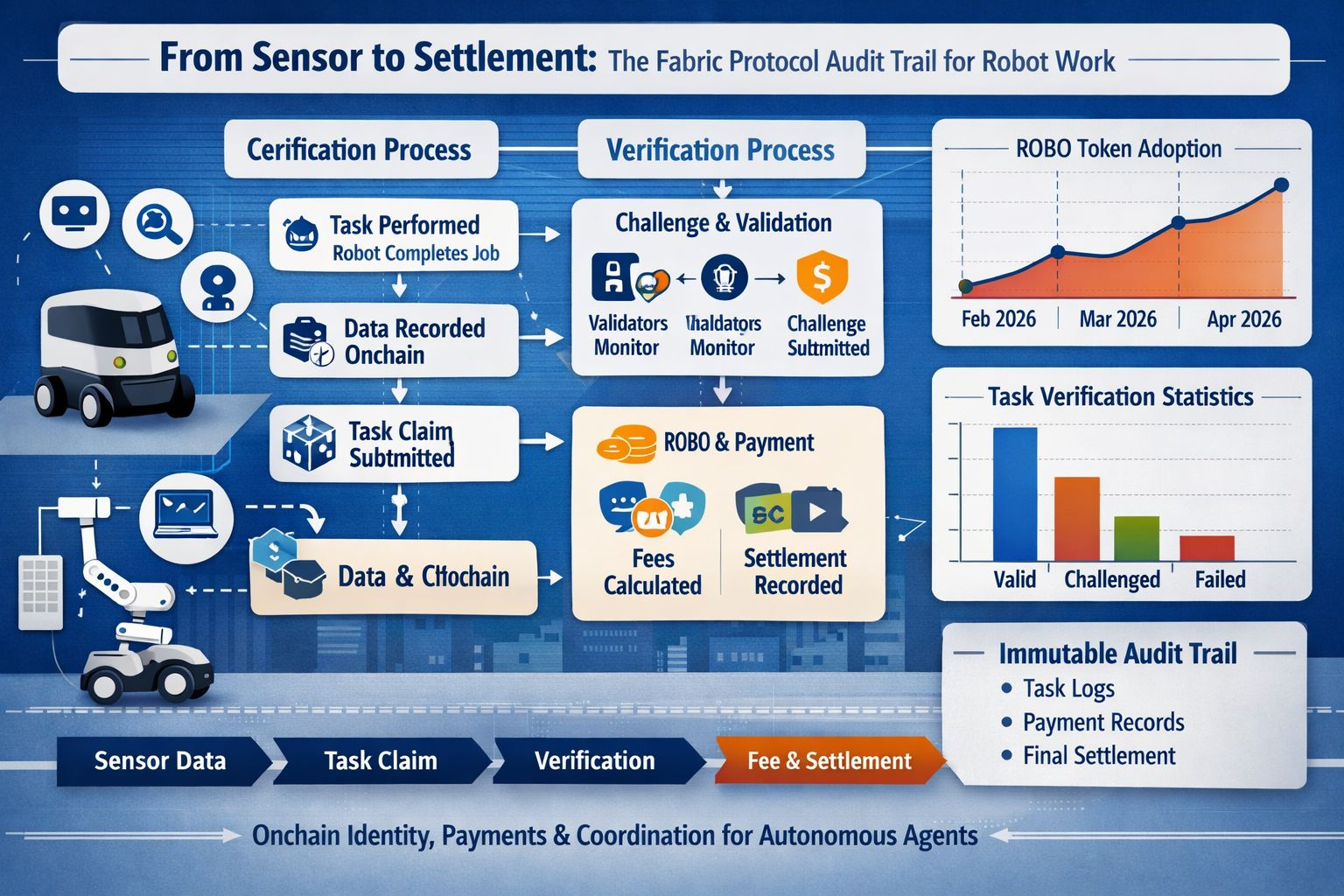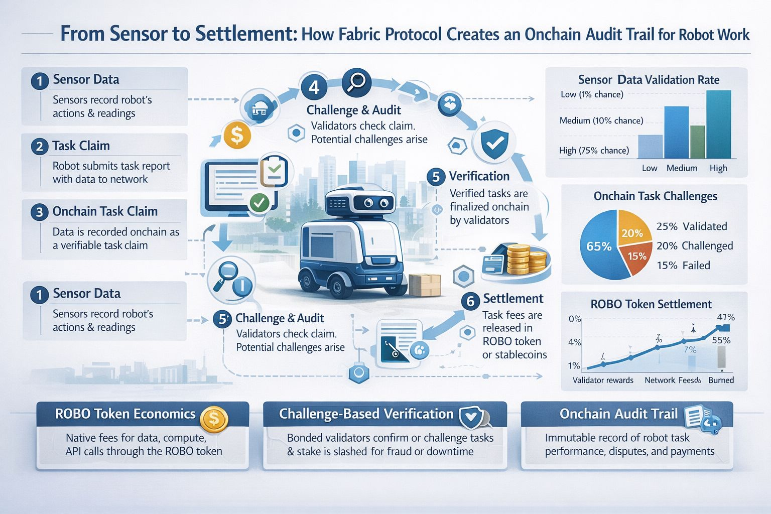 That question is the simplest way I can explain Fabric Protocol. I do not read it as a flashy robot story because to me it looks more like an accounting story with physical consequences. Fabric describes the network as infrastructure for onchain identity and payments along with coordination and verification for robots and autonomous agents so work can be tracked from action in the world to settlement on a ledger. In that frame a sensor reading turns into a task claim and then into a challenge or a fee and finally into settlement instead of being left scattered across private databases.