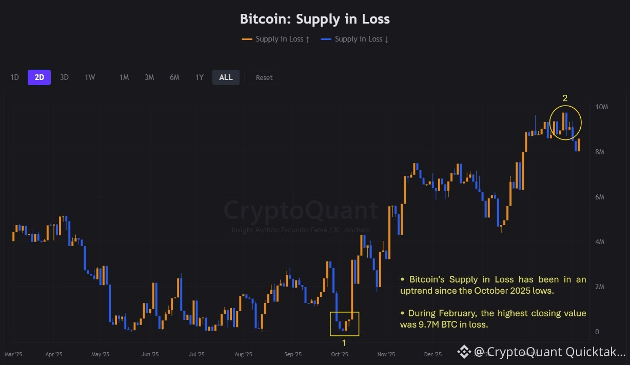 • Insight: Bitcoin’s Supply in Loss has been in an uptrend since the October 2025 lows. During February, the highest closing value was 9.7M BTC in loss.
