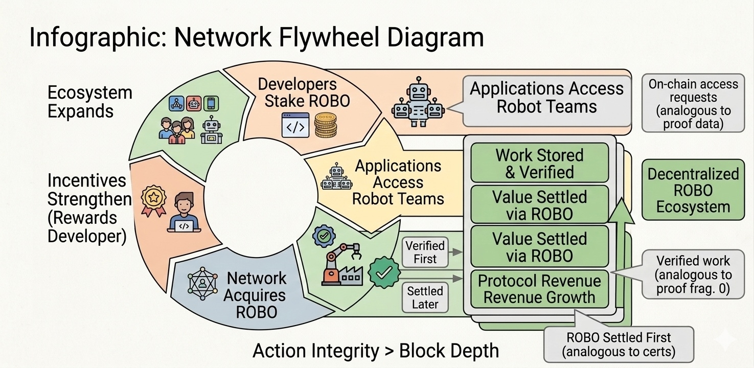 The structure is designed to support a network that runs continuously as robots generate work not just market hype around a token launch.