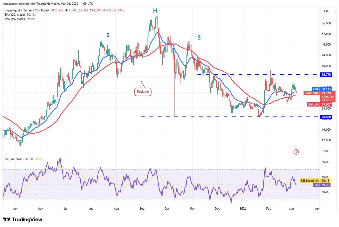 Se il prezzo di Hyperliquid rimbalza dalle medie mobili con forza, i tori tenteranno di portare nuovamente la coppia HYPE/USDT alla resistenza sovrastante di $36.77. Una chiusura sopra il livello di $36.77 segnala l'inizio di un nuovo rialzo.
