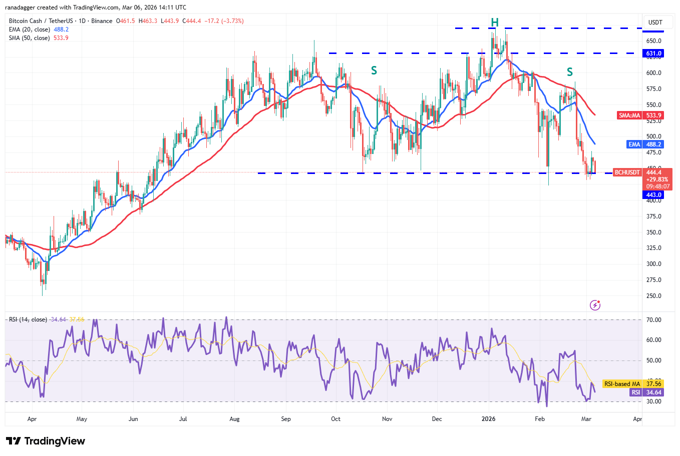Gli orsi tenteranno di rafforzare la loro posizione portando il prezzo di Bitcoin Cash sotto il supporto di $443. Se ci riescono, la coppia BCH/USDT completerà un modello ribassista testa e spalle. La coppia potrebbe poi crollare a $375.