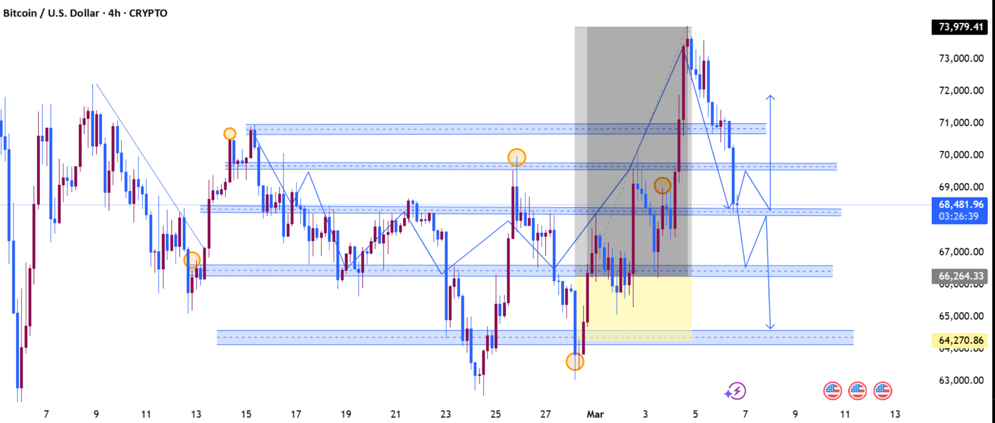 بيتكوين قام بتحرك حاد إلى 74K، ولكن قد يكون هذا الارتفاع قد كان مجرد استغلال للسيولة، وليس اختراقًا حقيقيًا.بعد مسح القمم، رفض السعر بسرعة وهبط مرة أخرى إلى النطاق.ما يعنيه هذا حقًا: قد يكون السوق يستعد لسحب أعمق قبل الحركة الكبيرة التالية.مقاومة رئيسية – 70.8K إلى 71.2Kهذه هي منطقة الاختراق الرئيسية.إذا عادت بيتكوين فوق ذلك، يستعيد الثيران السيطرة.دعم قوي – 66Kمنطقة رد فعل رئيسية حيث تدخل المشترون من قبل.أكبر تجمع سيولة – 64Kهذا هو المكان الذي تتواجد فيه الكثير من أوامر إيقاف الخسائر.إذا تحول السوق إلى الهبوط، يمكن أن يتم سحب السعر هنا مثل المغناطيس.أفضل مسار هابط (المفضل على المدى القصير)ارتداد إلى 69–70Kرفض قويانخفاض إلى 66Kسحب سيولة محتمل بالقرب من 64K