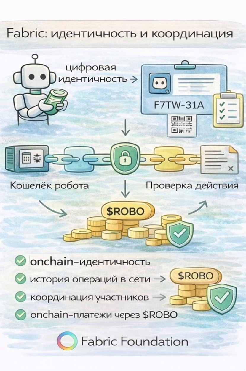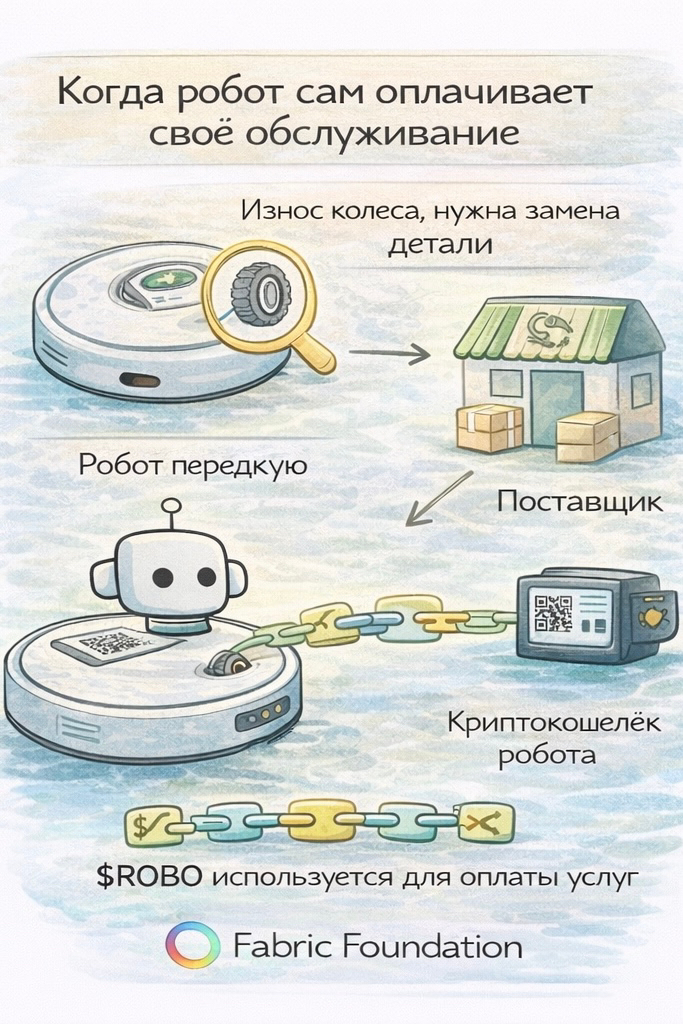 В архитектуре Fabric все происходит иначе. Устройство имеет onchain-идентичность и криптокошелёк. Робот фиксирует проблему, отправляет запрос поставщику и оплачивает заказ через токен $ROBO. Транзакция записывается в сети, а поставщик видит подтверждение операции и идентификатор устройства. Фактически машина сама организует своё обслуживание. Такая модель работает только при наличии инфраструктуры. Fabric как раз пытается построить этот слой. Роботы получают onchain-идентичность, которая позволяет проверять историю устройства и его действия. Они используют крипто-кошельки для оплаты услуг. А сама сеть выступает координационным механизмом, где задания распределяются между участниками, а расчёты происходят через $ROBO. В этой логике робот уже не инструмент. Он становится участником сети. Он получает задачи, выполняет работу и оплачивает ресурсы.