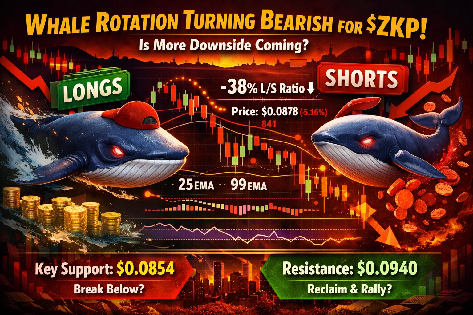 Price action reflects that pressure. ZKP fell 5.16% to $0.0878, slipping below key moving averages including the 25 EMA and 99 EMA, while MACD remains negative. Momentum indicators are not extremely oversold yet, but the current setup leans bearish unless buyers step in soon.