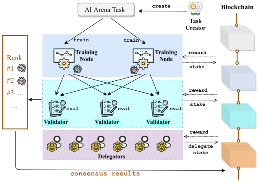 This kind of node based consensus in a decentralized setup looks a lot like this diagram from blockchain-AI projects nodes collaborating to validate and agree: