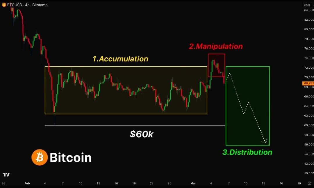 Potential Capitulation: Once distribution is over, the market often enters a sharp corrective phase to hunt for lower demand zones ($60k - $50k).