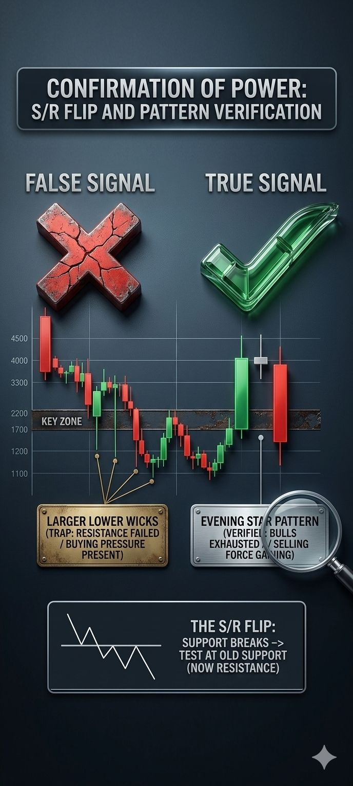 The Retest: Price pulls back up to that same level. What was once "floor" (support) now becomes "ceiling" (resistance).