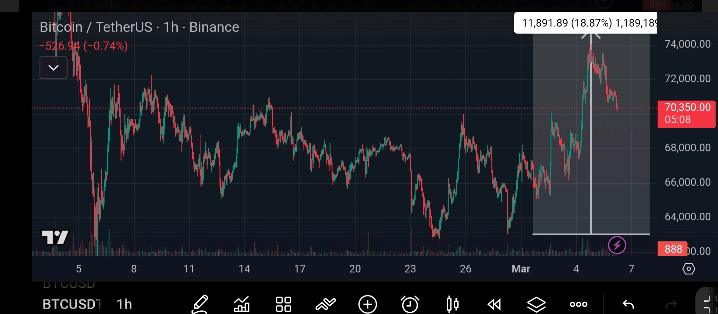 What makes the recent move notable is the impulsive breakout that occurred in early March. Bitcoin surged from the $63K–$64K demand zone and rapidly pushed toward the $74K region, marking an approximately 18% expansion in price within a relatively short time frame. Such moves are rarely random; they usually occur when liquidity above key resistance levels is triggered, forcing short positions to close while momentum traders enter the market.