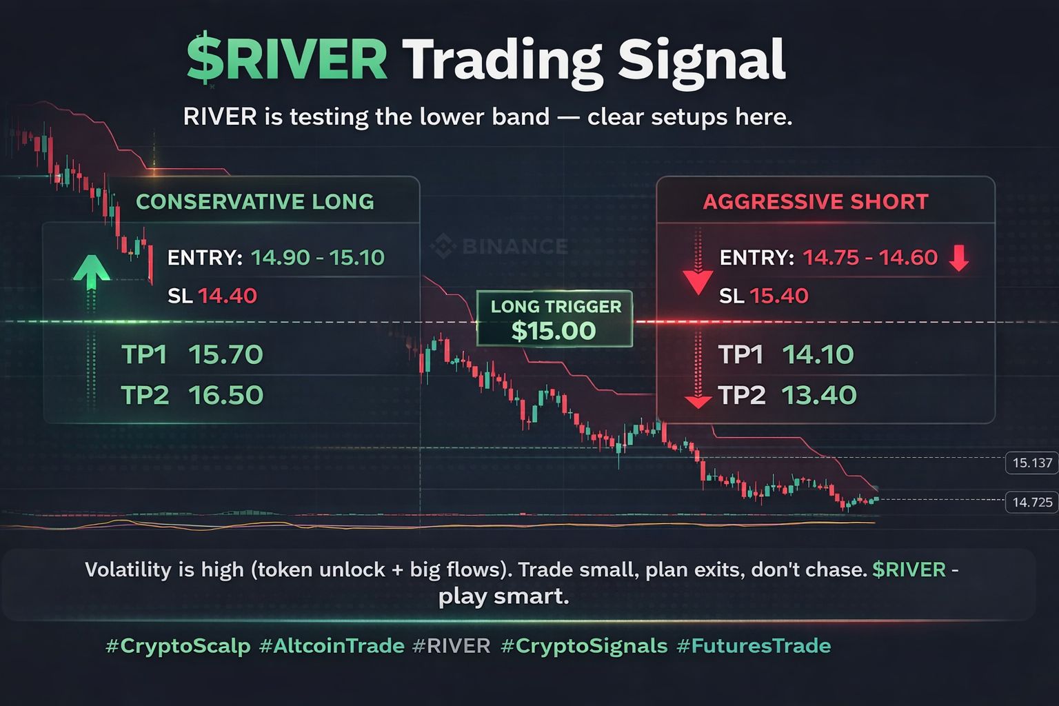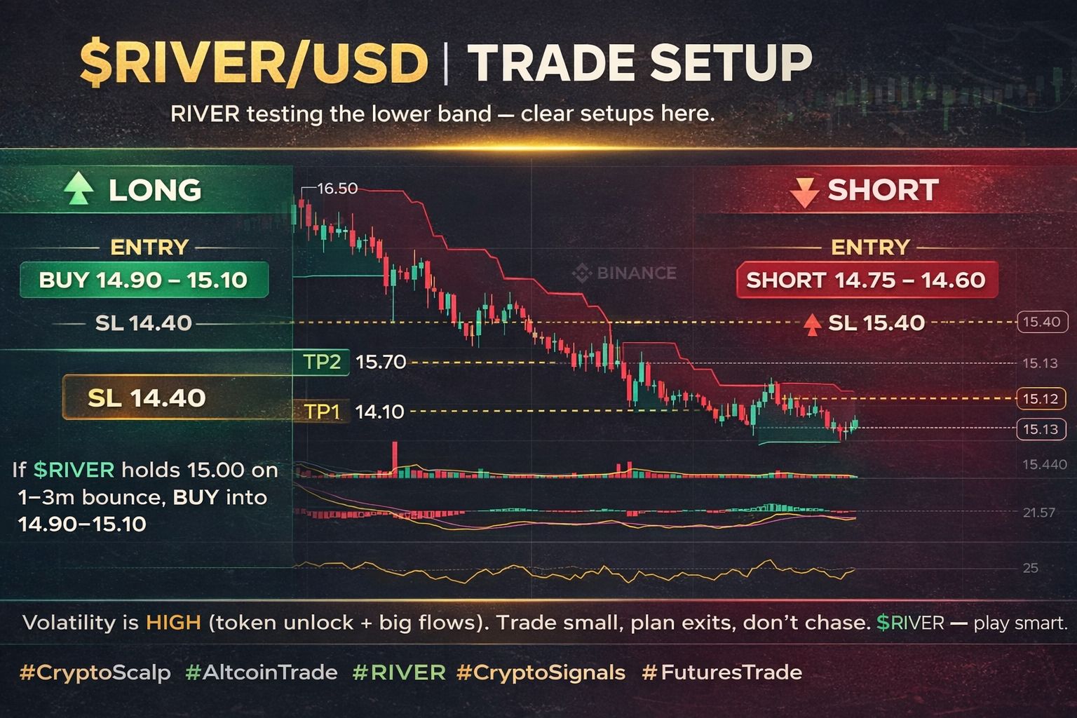 RIVER is testing the lower band — clear setups here. If $RIVER holds 15.00 on a 1–3m bounce, buy into 14.90–15.10 with SL 14.40 → TP1 15.70 / TP2 16.50.