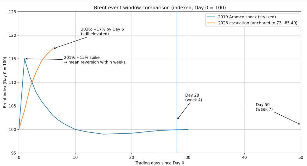 Il grafico dei prezzi del petrolio Brent per il conflitto Stati Uniti-Israele-Iran del 2026 mostra un rally sostenuto del 17% in sei giorni, in contrasto con il rapido modello di inversione visto durante l'attacco ad Aramco nel 2019.
