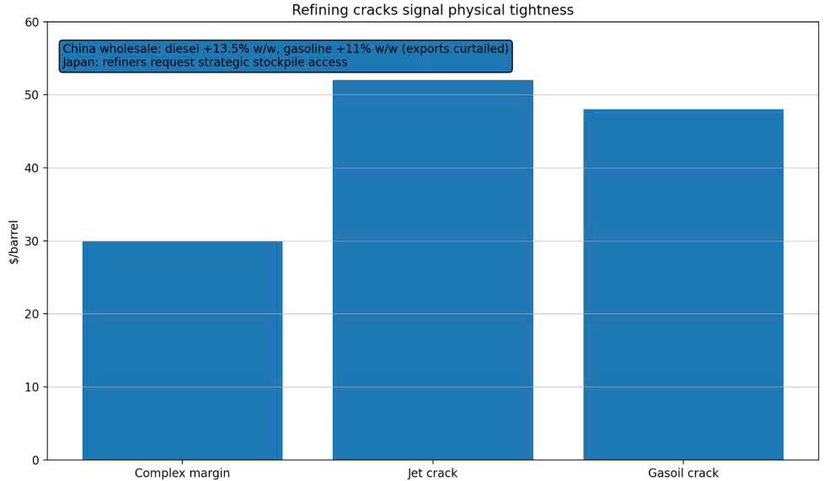 I margini di raffinazione in Asia sono aumentati ai massimi pluriennali, con i prezzi del carburante per aerei che superano i $52 e il diesel che supera i $48 al barile, riflettendo una severa ristrettezza nel mercato fisico.