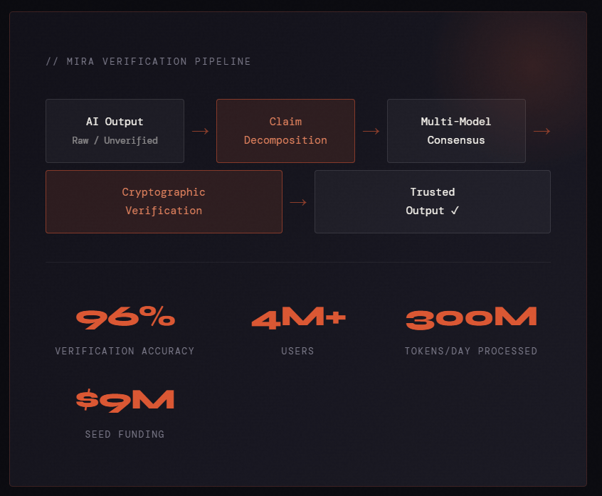 The result? First-pass error rates drop from ~30% to ~5%. Mira's research roadmap targets sub-0.1%. That's not incremental — that's a fundamental shift in what AI can be trusted to do autonomously.