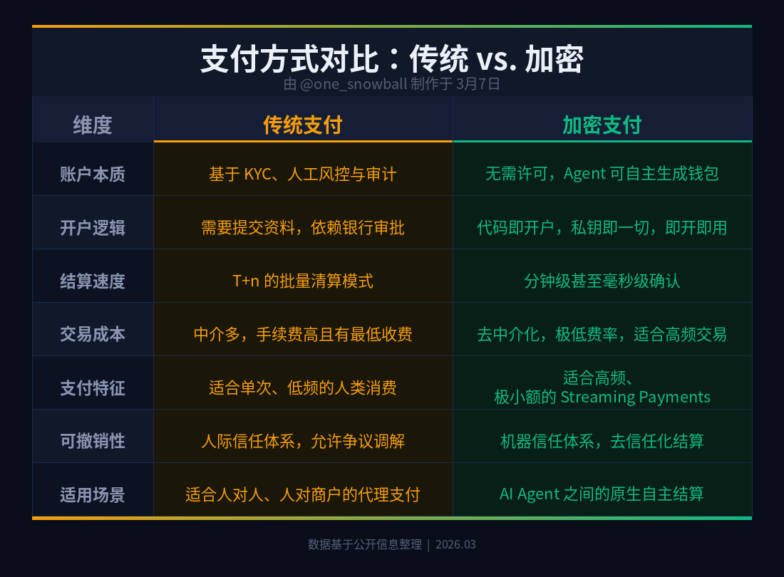 很明显在交易速度、抗审查性、适合场景等几乎所有的纬度都证明AI agent更适合用加密支付