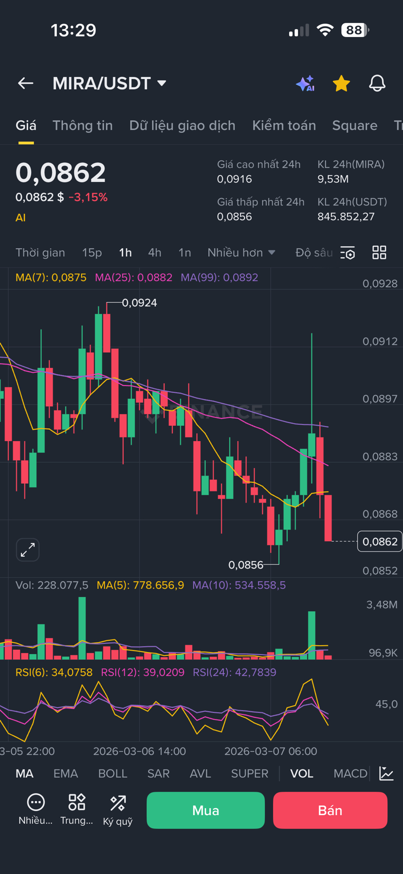 Il volume di scambi nelle ultime 24 ore è sceso a soli 9,53 milioni di MIRA, equivalenti a circa 845,85 mila USDT. Un numero troppo modesto per poter generare un qualsiasi rimbalzo significativo. Il denaro intelligente sembra essersi ritirato dal massimo di 0,0924 USD, lasciando un mercato privo di liquidità e vulnerabile a qualsiasi pressione di vendita minima. 💸🌫️