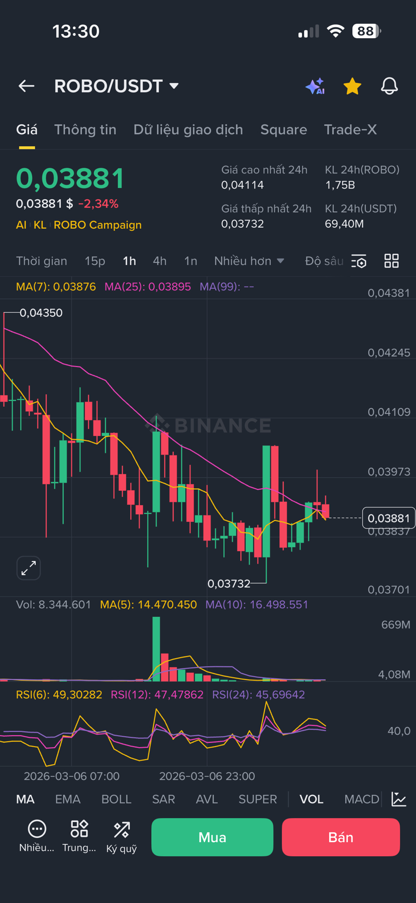 Điểm đáng chú ý nhất chính là chỉ số RSI(6) đã thoát khỏi vùng bi quan để leo lên mức 49,30. Nó cho thấy một sự thay đổi âm thầm trong tâm lý: phe bán đã bắt đầu mỏi tay và phe mua đang rục rịch gom hàng tại vùng hỗ trợ "vàng" 0,03732 USD. Khối lượng giao dịch khổng lồ đạt 1,75 tỷ ROBO (tương đương 69,40 triệu USDT) chứng tỏ đây không phải là một dự án "chết", mà là một "chiến trường" thực thụ nơi dòng tiền lớn đang luân chuyển cực mạnh. 🙄💅