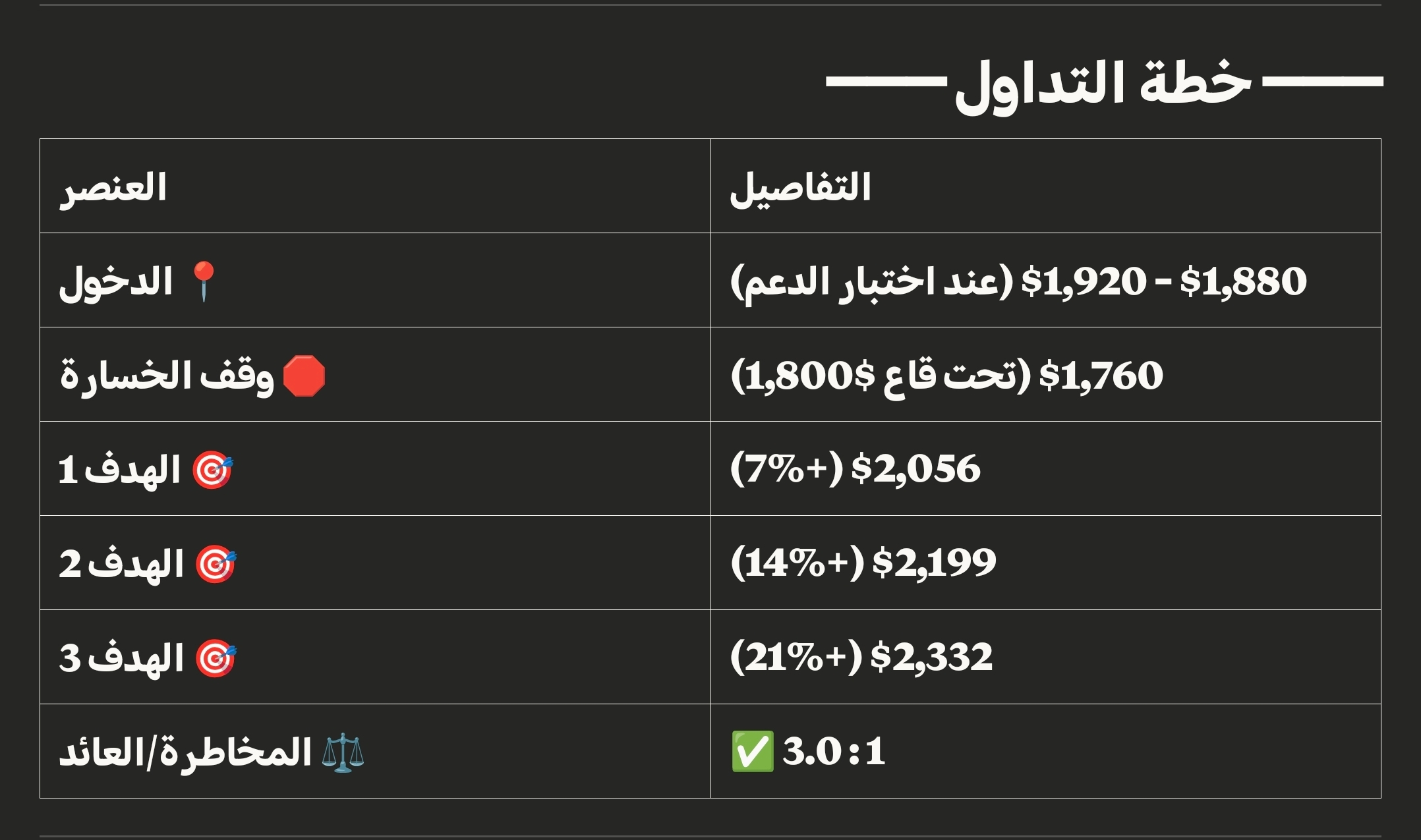 تتدرج الخطة في ثلاثة أهداف ربحية متصاعدة، من هدف قصير المدى عند **$2,056** (+7%)، مروراً بهدف متوسط عند **$2,199** (+14%)، وصولاً لهدف طموح عند **$2,332** (+21%) عند المتوسط المتحرك MA200، مع نسبة مخاطرة للعائد جيدة **1:3.0** تجعل الصفقة مجدية استثمارياً.