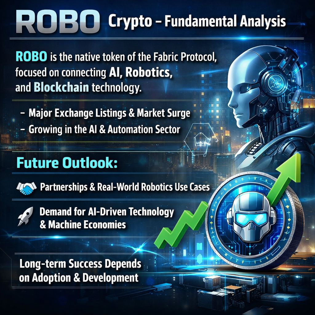 $ROBO is the native token of Fabric Protocol, a blockchain project designed to connect AI systems, robots, and decentralized networks. The project aims to create a “robot economy” where machines can perform tasks, share data, and receive payments automatically through blockchain.