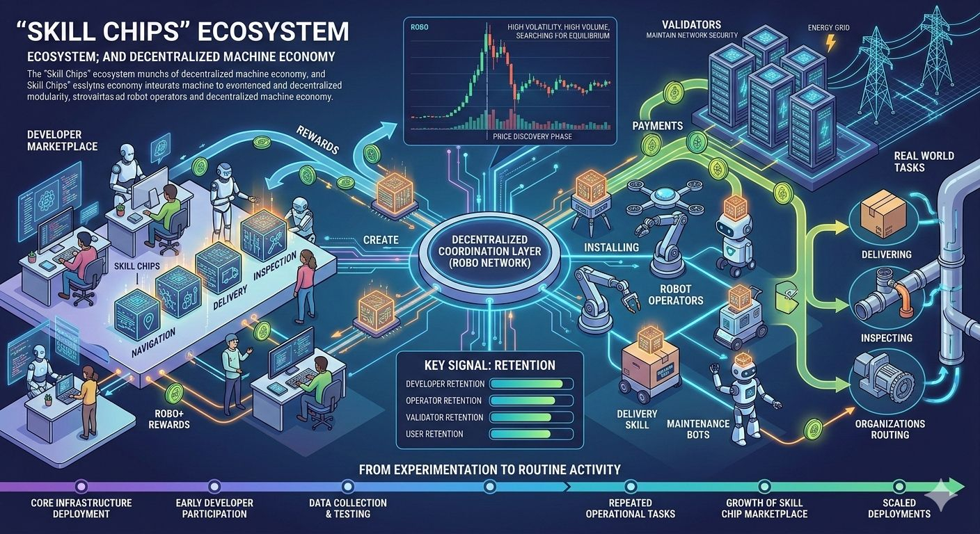 Developers must continue building skill chips after early reward programs fade. Operators must route real robotic tasks through the system rather than simply participating for token rewards. Validators must maintain infrastructure even when operations become routine instead of exciting.