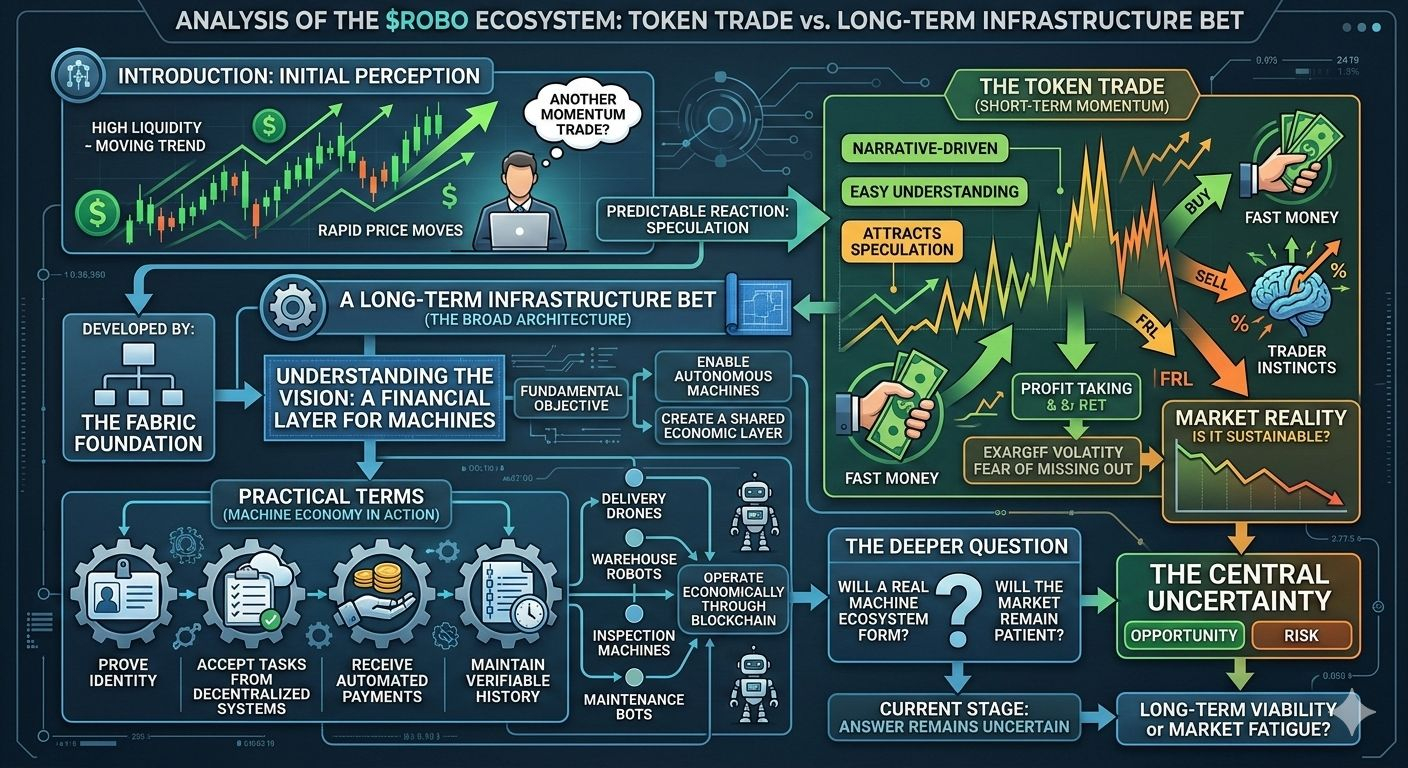 When most traders first notice $ROBO the reaction is predictable. The chart moves fast, liquidity spikes, and the narrative is easy to understand: robotics plus blockchain plus AI. In the current crypto environment, that combination naturally attracts speculation.