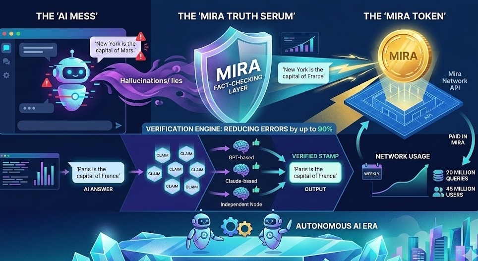 Enter Mira Network. Instead of building yet another AI model, Mira is building a truth serum for AI. Think of it as a fact-checking layer that sits underneath existing bots to catch their lies .