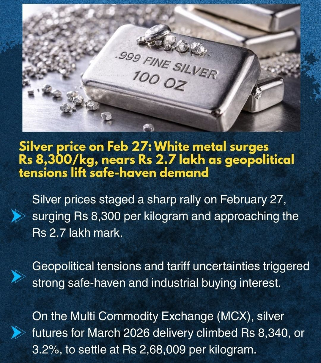 Silver prices staged a sharp rally on February 27, surging Rs 8,300 per kilogram and approaching the Rs 2.7 lakh mark.@Mira - Trust Layer of AI