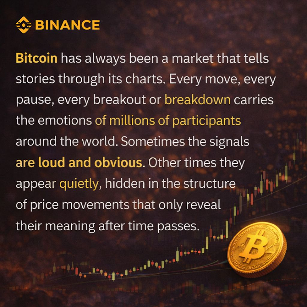 Bitcoin has always been a market that tells stories through its charts. Every move, every pause, every breakout or breakdown carries the emotions of millions of participants around the world. Sometimes the signals are loud and obvious. Other times they appear quietly, hidden in the structure of price movements that only reveal their meaning after time passes.