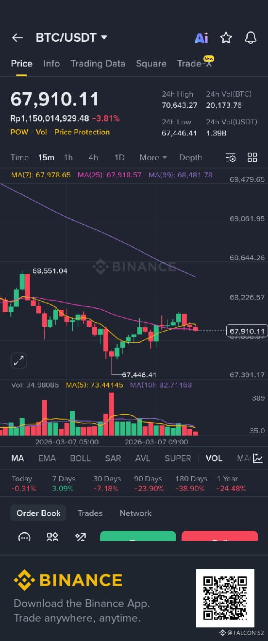 The $BTC market is currently in a consolidation phase, trading around the $67,900 level after falling earlier from above $70,000. The price briefly dropped to around $67,400 before buyers stepped in, preventing further decline.