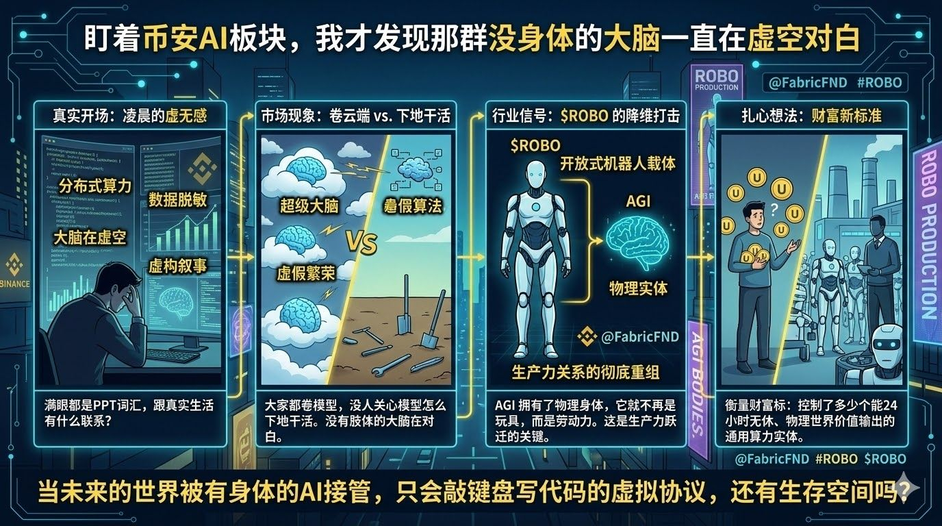 这几天凌晨,我几乎是机械性地在币安行情列表里上下滑动,满眼都是所谓的“分布式算力”、“数据脱敏”或者“去中心化训练”。说实话,看多了真的会有一种莫名的虚无感。这些项目像是在比赛谁的 PPT 词汇更高级,谁的逻辑更绕,但关上屏幕想一想,这些 AI 除了在云端烧钱、在网页里写点不痛不痒的废话,到底跟我们的真实生活有什么本质联系?