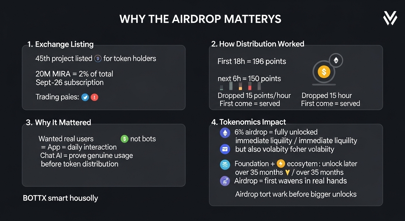 perché è importante? perché ha mostrato che mira voleva utenti reali, non solo bot. il programma di punti dell'app klok richiedeva interazione quotidiana con l'AI per dimostrare un utilizzo genuino prima della distribuzione dei token. il 6% dell'airdrop è stato completamente sbloccato al TGE creando liquidità immediata ma anche volatilità. la riserva di fondazione e le cose dell'ecosistema sono state sbloccate successivamente in oltre 35 mesi, quindi l'airdrop è stato come la prima ondata di ottenere token nelle mani reali prima che iniziassero a verificarsi sblocchi più grandi. piuttosto intelligente, onestamente bro.