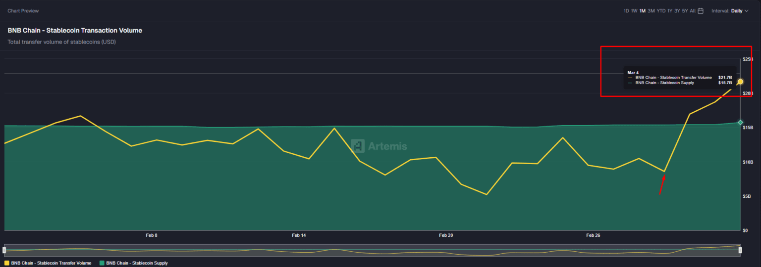 Gần đây, BNB Chain cũng ghi nhận khoảng 21.7 tỷ USD stablecoin được chuyển trong một ngày, mức cao nhất trong vòng một năm qua. Con số này cho thấy mạng lưới đang đóng vai trò như một lớp giao dịch stablecoin có throughput cao.